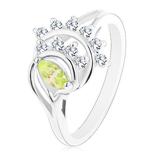 Popis produktu Blýskavý prsten, oblouky lemované liniemi čirých zirkonků, světle zelené zrnko - Velikost: 60