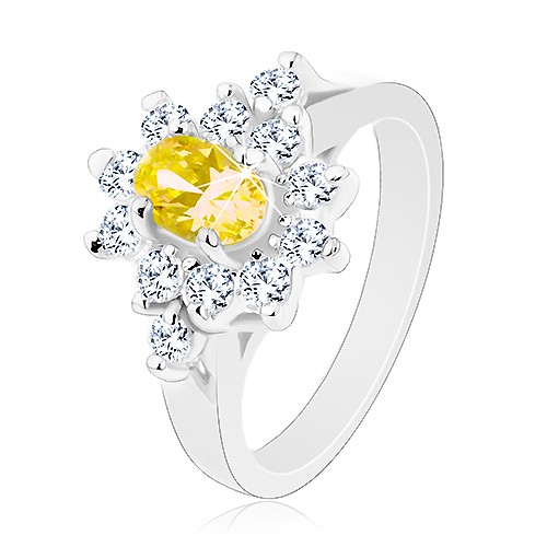 Popis produktu Blýskavý prsten, oválný zirkon žluté barvy, kontura z čirých zirkonků - Velikost: 56