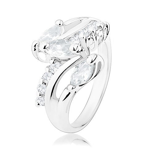 Prsten ve stříbrném odstínu, rozdělená ramena, tři čirá zirkonová zrníčka, pásy drobných čirých zirkonků.Vybírejte to nejlepší u nás. Lepší nabídku už na trhu hledat nemusíte.