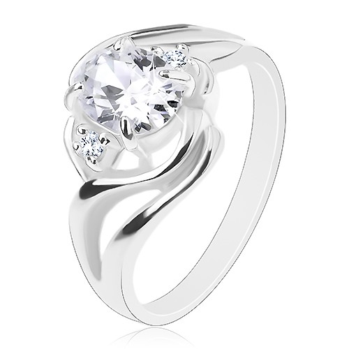 Popis produktu Blýskavý prsten, rozdělená zvlněná ramena, velký oválný zirkon čiré barvy - Velikost: 57