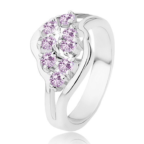 Popis produktu Blýskavý prsten s rozdělenými rameny, fialové kulaté zirkonky - Velikost: 51