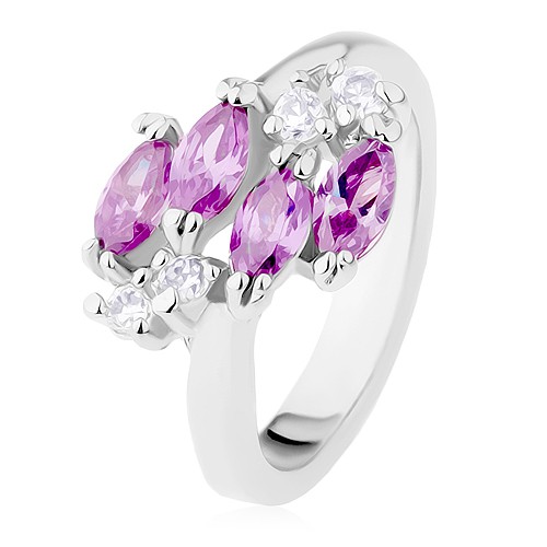 Popis produktu Blýskavý prsten stříbrné barvy, fialová zirkonová zrnka, čiré zirkonky - Velikost: 50