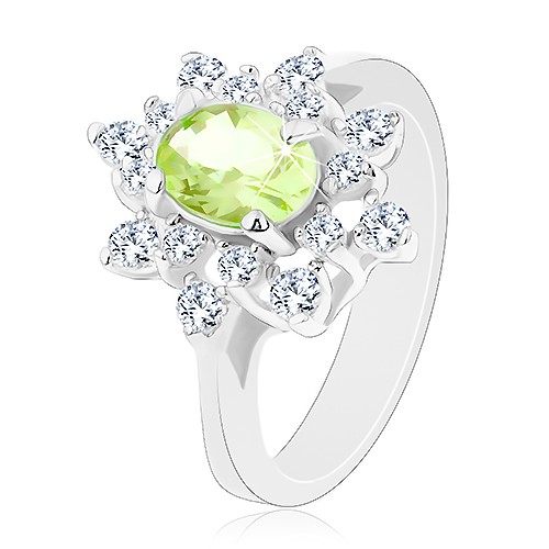 Popis produktu Blýskavý prsten stříbrné barvy, světle zelený zirkonový ovál, čiré lupínky - Velikost: 56