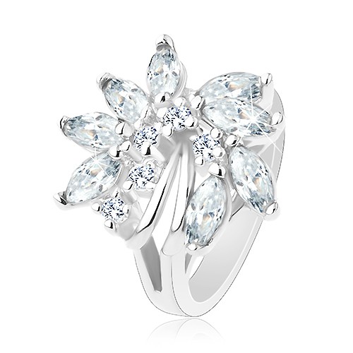 Popis produktu Blýskavý prsten, stříbrný odstín, nesouměrný květ ze zirkonů, lesklé obloučky - Velikost: 60, Barva: Čirá