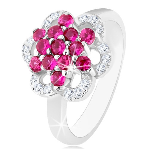 Popis produktu Blýskavý prsten, stříbro 925, lesklá ramena, květ z růžových a čirých zirkonů - Velikost: 50