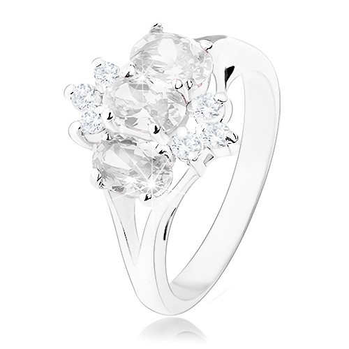 Popis produktu Blýskavý prsten ve stříbrném odstínu, oválné a kulaté zirkony čiré barvy - Velikost: 53
