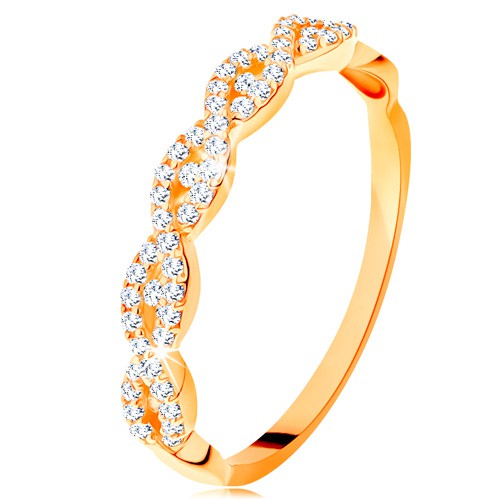 Popis produktu Blýskavý prsten ze žlutého 14K zlata - rozdělená propletená ramena, zirkony - Velikost: 51