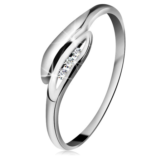 Briliantový prsten v bílém 14K zlatě - mírně zahnuté lístečky, tři čiré diamanty - Velikost: 58