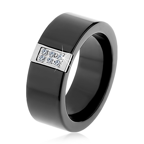 Popis produktu Černý keramický prsten s hladkým povrchem, ocelový obdélník se zirkony - Velikost: 65