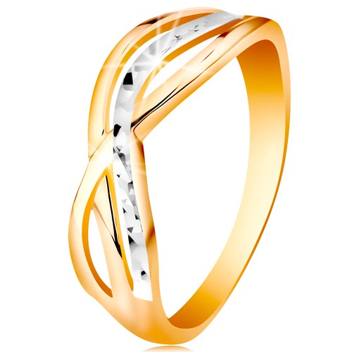 Popis produktu Dvoubarevný prsten ve 14K zlatě - zvlněné a rozvětvené linie ramen, rýhy - Velikost: 52
