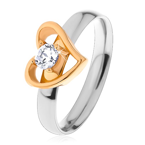 Prsten z chirurgické oceli, zaoblená ramena stříbrné barvy, obrys nesouměrného srdce ve zlatém odstínu, kulatý čirý zirkon.Nabídku e-shopu pro vás připravuje tým odborníků. Už se těšíte na svoji objednávku?
