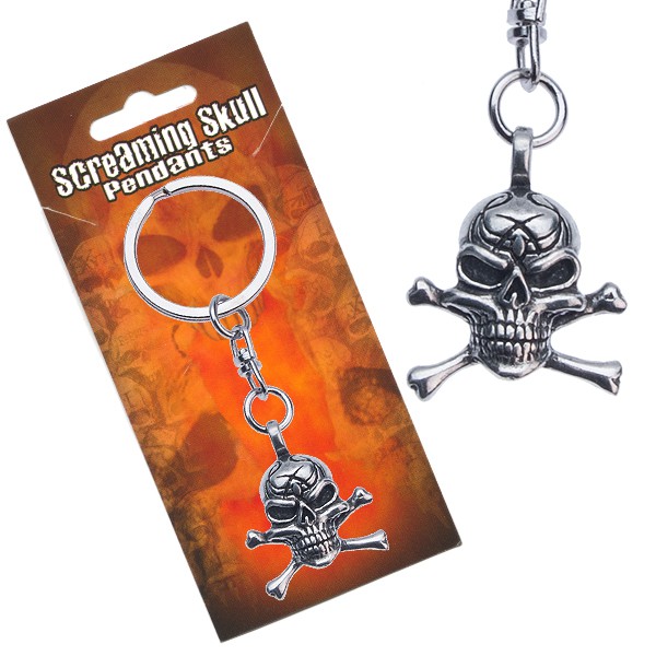 Popis produktu Kovový přívěsek na klíče, lebka s překříženými hnáty