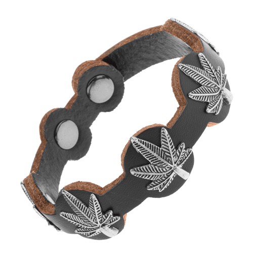 Popis produktu Kožený náramek černé barvy, patinované listy marihuany z oceli
