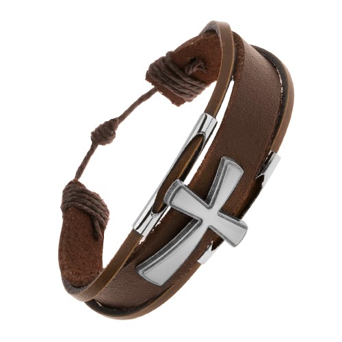 Popis produktu Kožený náramek hnědé barvy, velký matný kříž s patinou, ocelové ovály