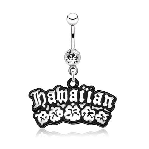 Popis produktu Lesklý ocelový piercing do břicha - černobílý nápis Hawaiian, květy