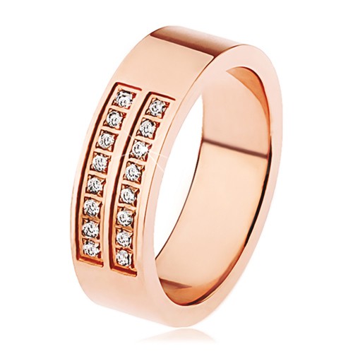 Popis produktu Lesklý ocelový prsten měděné barvy, dvě linie čirých zirkonů - Velikost: 63
