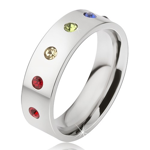Popis produktu Lesklý ocelový prstýnek, šest barevných kulatých kamínků - Velikost: 52