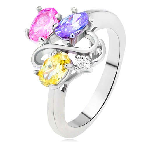Popis produktu Lesklý prsten - barevné oválné zirkony, linie dvojitého S, čirý kamínek - Velikost: 58