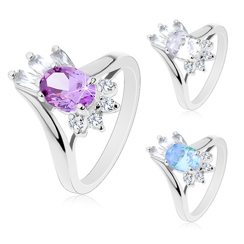 Popis produktu Lesklý prsten, broušený oválný zirkon, obdélníkové a kulaté zirkonky čiré barvy - Velikost: 50, Barva: Fialová