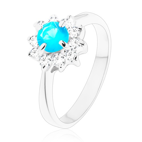 Popis produktu Lesklý prsten s úzkými hladkými rameny, zirkonový květ modré a čiré barvy - Velikost: 49
