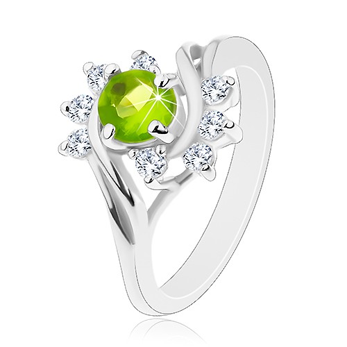 Popis produktu Lesklý prsten se stříbrnou barvou, oblouky z čirých zirkonů, světle zelený zirkon - Velikost: 54