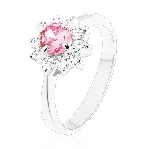 Popis produktu Lesklý prsten se zirkonovým kvítkem v růžové a čiré barvě, zúžená ramena - Velikost: 59