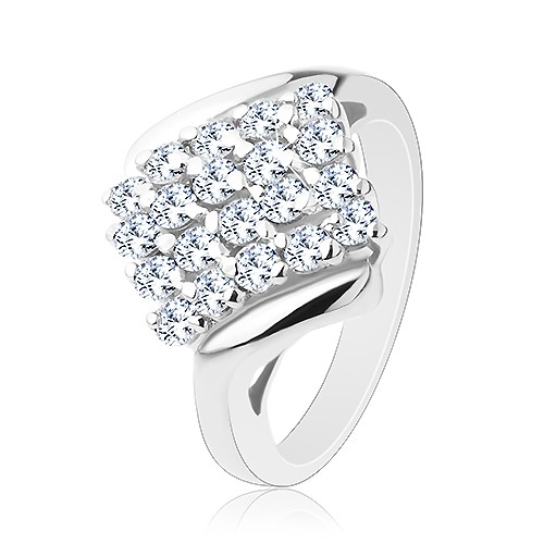 Popis produktu Lesklý prsten stříbrné barvy, blýskavý čtverec posetý barevnými zirkony - Velikost: 53, Barva: Světle oranžová