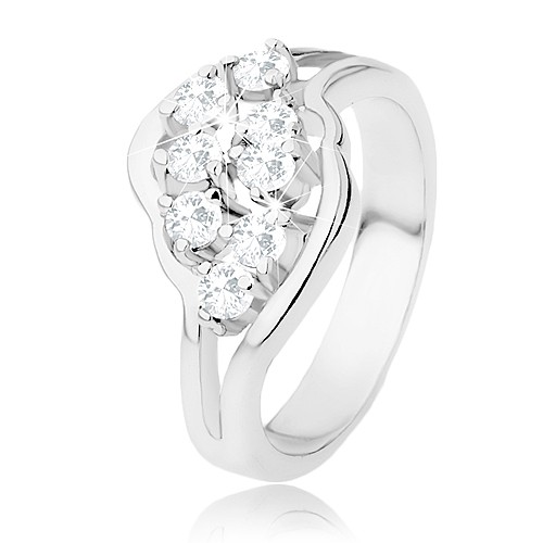Popis produktu Lesklý prsten stříbrné barvy, rozdělená ramena, čiré blýskavé zirkony - Velikost: 52