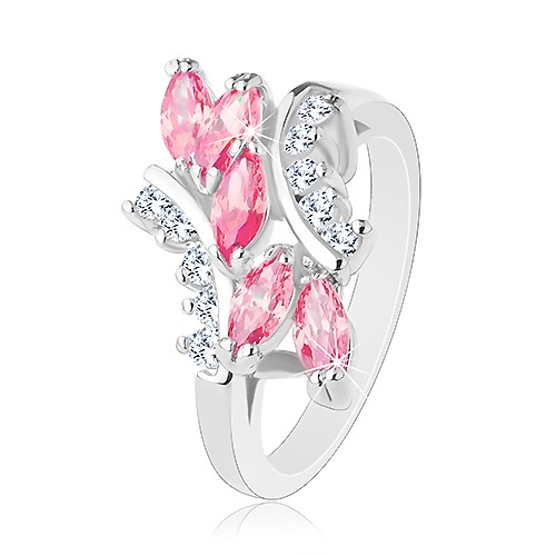 Popis produktu Lesklý prsten stříbrné barvy, růžová zirkonová zrnka, čiré zirkonky - Velikost: 51