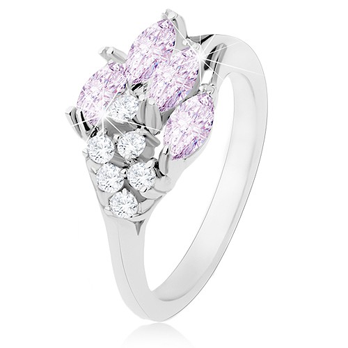 Lesklý prsten stříbrné barvy, světle fialová zrnka, kulaté čiré zirkony - Velikost: 52