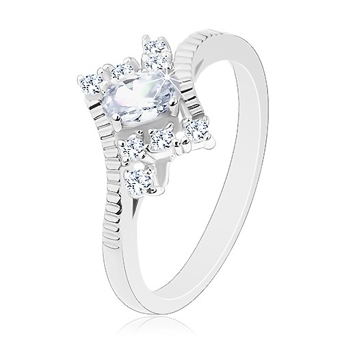 Popis produktu Lesklý prsten stříbrné barvy, vroubky na ramenech, čirý zirkonový ovál - Velikost: 49
