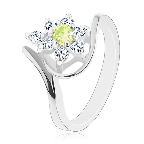 Popis produktu Lesklý prsten stříbrné barvy, zirkonový kvítek se žlutozeleným středem - Velikost: 53