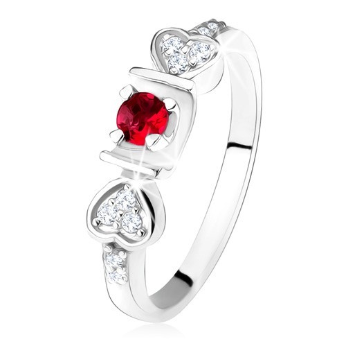 Stříbrný 925 prsten, lesklý, s kulatým tmavě růžovým kamínkem, zirkonová srdíčka a linie.Ceny a dodací lhůty tlačíme stále dolů. Přejeme vám příjemné nakupování.