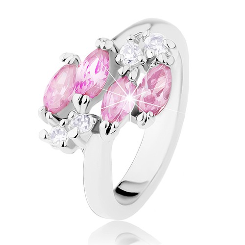 Popis produktu Lesklý prsten ve stříbrné barvě, růžová zirkonová zrnka, čiré zirkonky - Velikost: 53