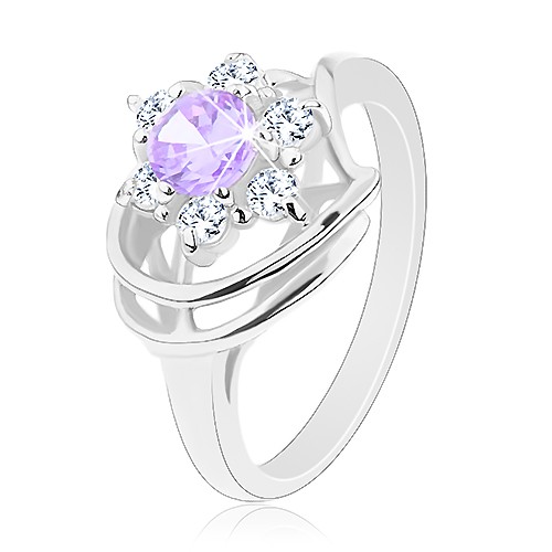 Lesklý prsten ve stříbrném odstínu, světle fialovo-čirý zirkonový květ, obloučky - Velikost: 51