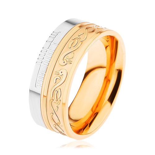 Popis produktu Lesklý prsten z oceli 316L, zlatá a stříbrná barva, spirála, had, zářezy - Velikost: 67