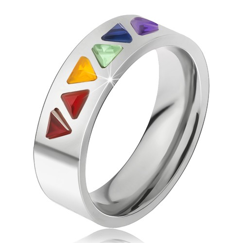 Popis produktu Lesklý prsten z oceli, barevné trojúhelníkové kamínky - Velikost: 59