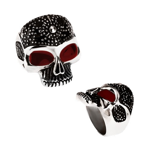 Popis produktu Masivní prsten z oceli 316L, patinovaná lebka, tečky, červené glazované oči - Velikost: 66