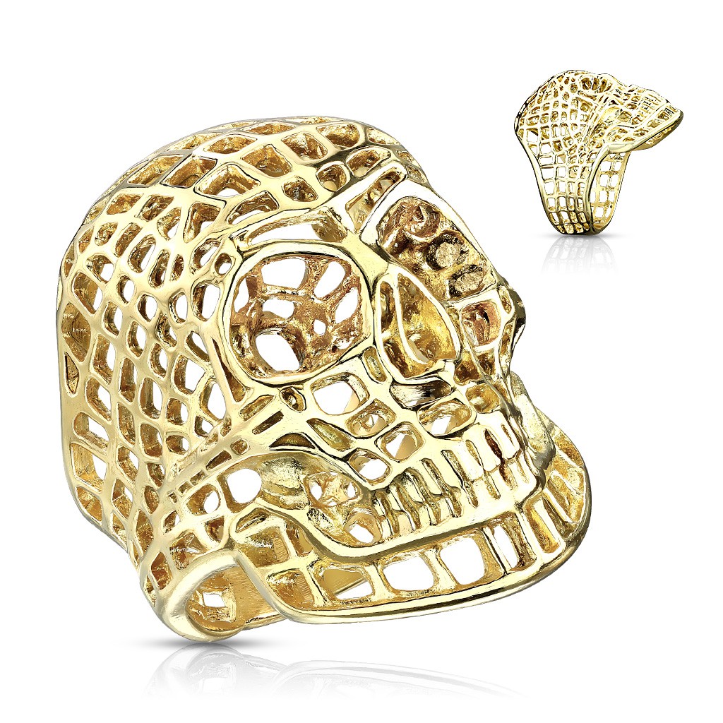Mohutný prsten z oceli 316L, lesklá zlatá barva, síťovaná lebka - Velikost: 73