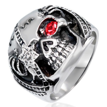 Popis produktu Mohutný prsten z oceli - lebka bojovníka s červeným zirkonem, patina - Velikost: 60