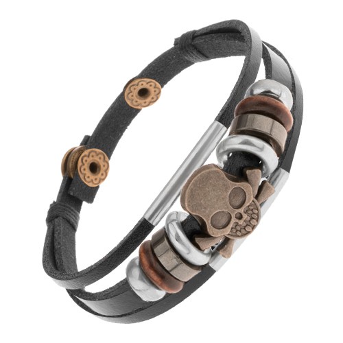 Popis produktu Náramek z kožených pásů s korálky z kovu a ze dřeva, lebka