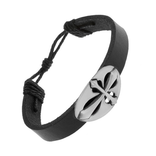 Popis produktu Nastavitelný náramek ze syntetické kůže, ovál s výřezem a křížem