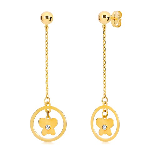 Náušnice ve žlutém 14K zlatě - kroužek s motýlem visící na řetízku od oblíbené značky Šperky Eshop - tento artikl nepropásněte ve výprodejové akci za 3 775 CZK. Zboží zařazené v našem katalogu vás nezklame. Jen nyní je POŠTOVNÉ ZDARMA, když si vyberete zboží nad Kč. Garantujeme spokojenost z nákupu.