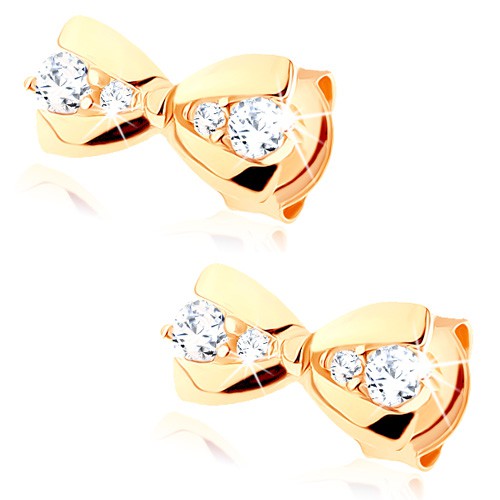 Popis produktu Náušnice ve žlutém 14K zlatě - malá mašlička, čiré kulaté zirkonky