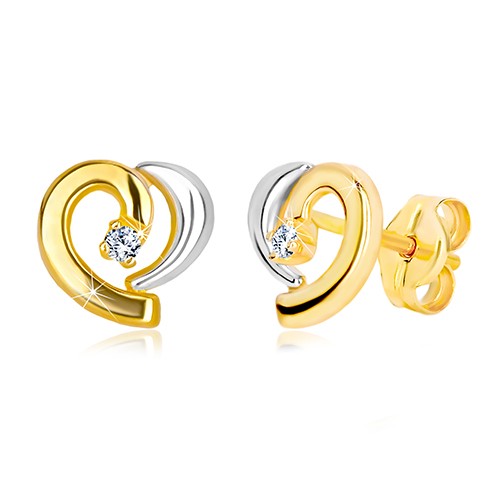 Zlaté náušnice 585 v podobě asymetrického obrysu srdce tvořeného dvoubarevnými oblouky s čirým zirkonem uprostřed.Ceny zboží a skladovou dostupnost neustále aktualizujeme. Zařaďte se mezi spokojené klienty.