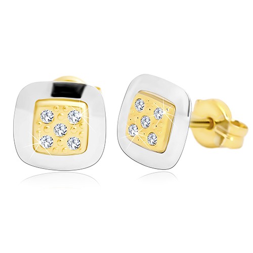 Náušnice ze 14K zlata - čtverec s čirými zirkony uprostřed, žluté a bílé zlato