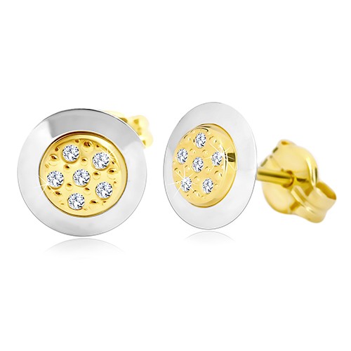 Popis produktu Náušnice ze 14K zlata - kruh s čirými zirkony uprostřed, žluté a bílé zlato
