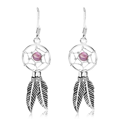 Náušnice ze stříbra 925, lapač snů s fialovým korálkem a pírky, 12 mm