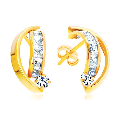 Zlaté puzetové náušnice 585, dva překřížené oblouky - jeden hladký a druhý zdobený vsazenými čtvercovými zirkony.Nakupujte v našem e-shopu za skvělé ceny. Nákup u nás potěší také vaši peněženku.