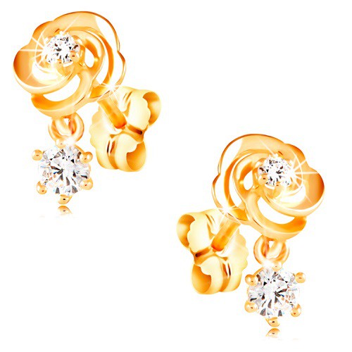 Popis produktu Náušnice ze žlutého 14K zlata, květ růže s čirými zirkony, puzetky